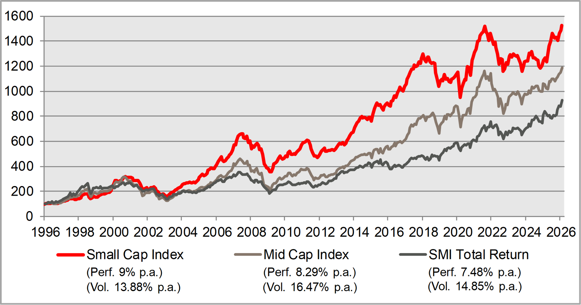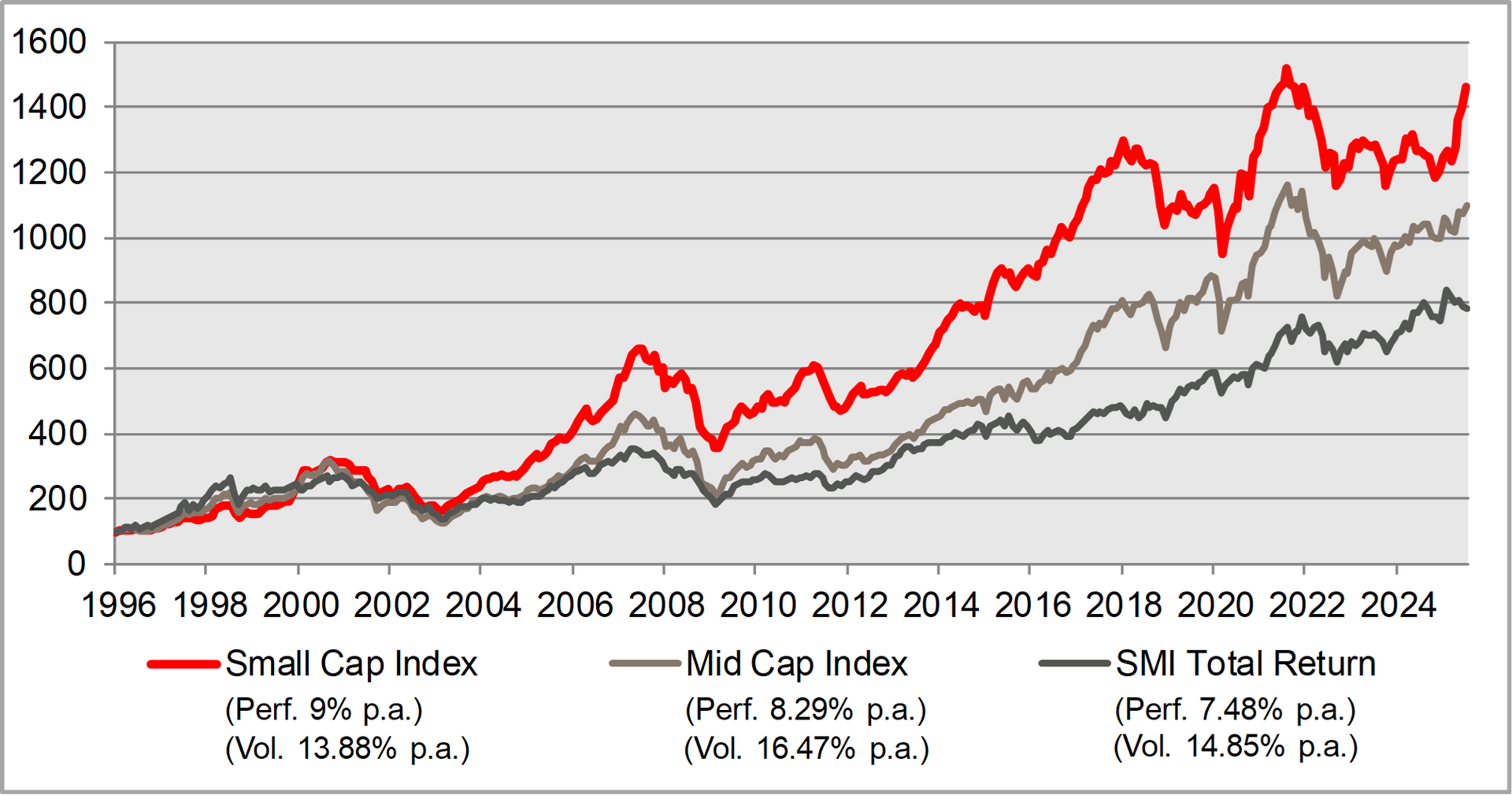 In Switzerland, there has been an average yearly small cap outperformance versus blue chips of 4% since 1996. Interestingly, this has happend with a lower volatility than the mid & large caps, where more trading orienented money is causing exagerations and therefore higher volatility.