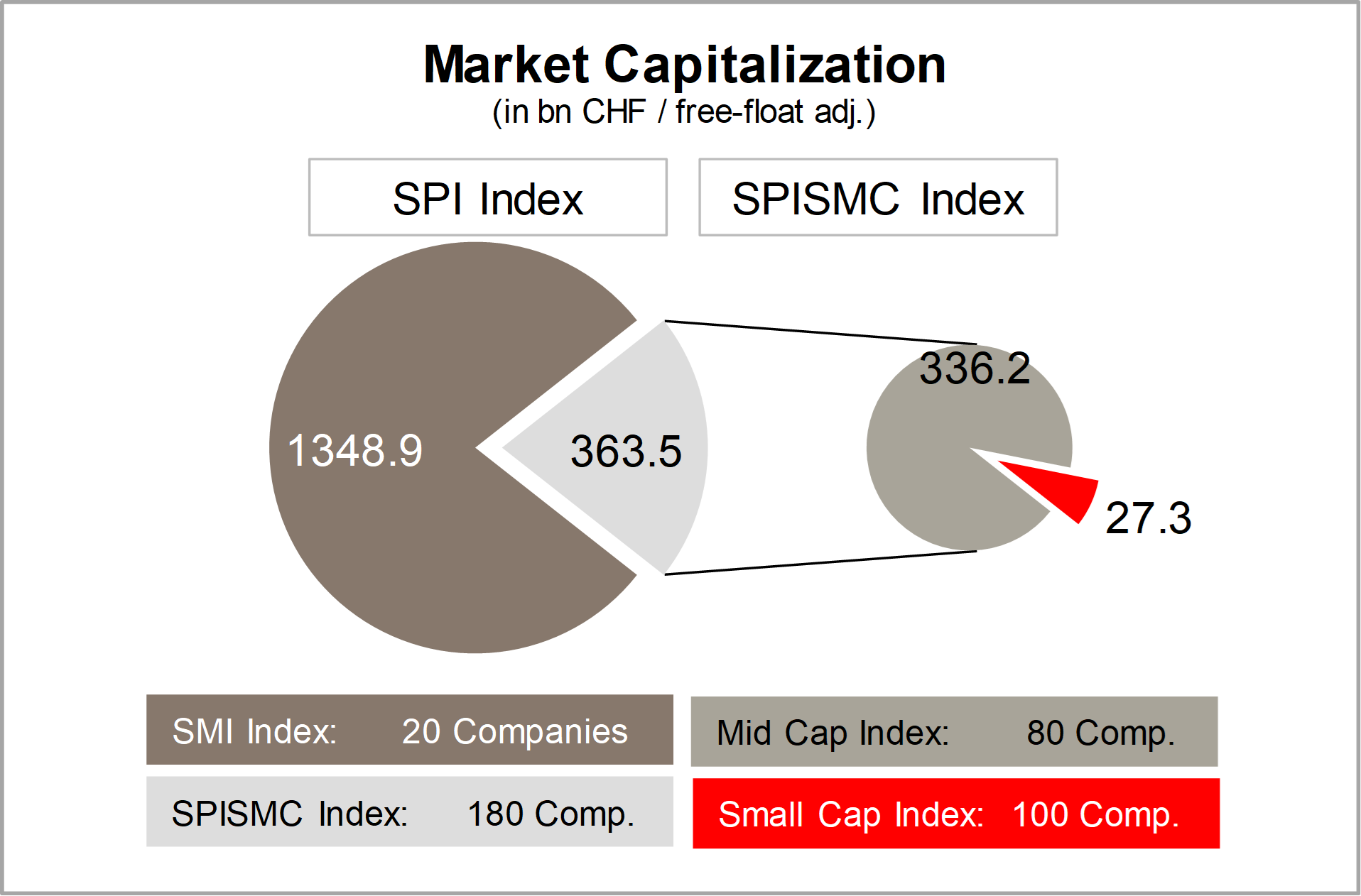 On the basis of free-float adjusted market caps the small & mid caps (SPISMC Index) has a share of about 15% of the total Swiss stock market (SPI Index). The in our portfolio over represented small caps only account for about 1.5%, even though they represent more than half of all companies