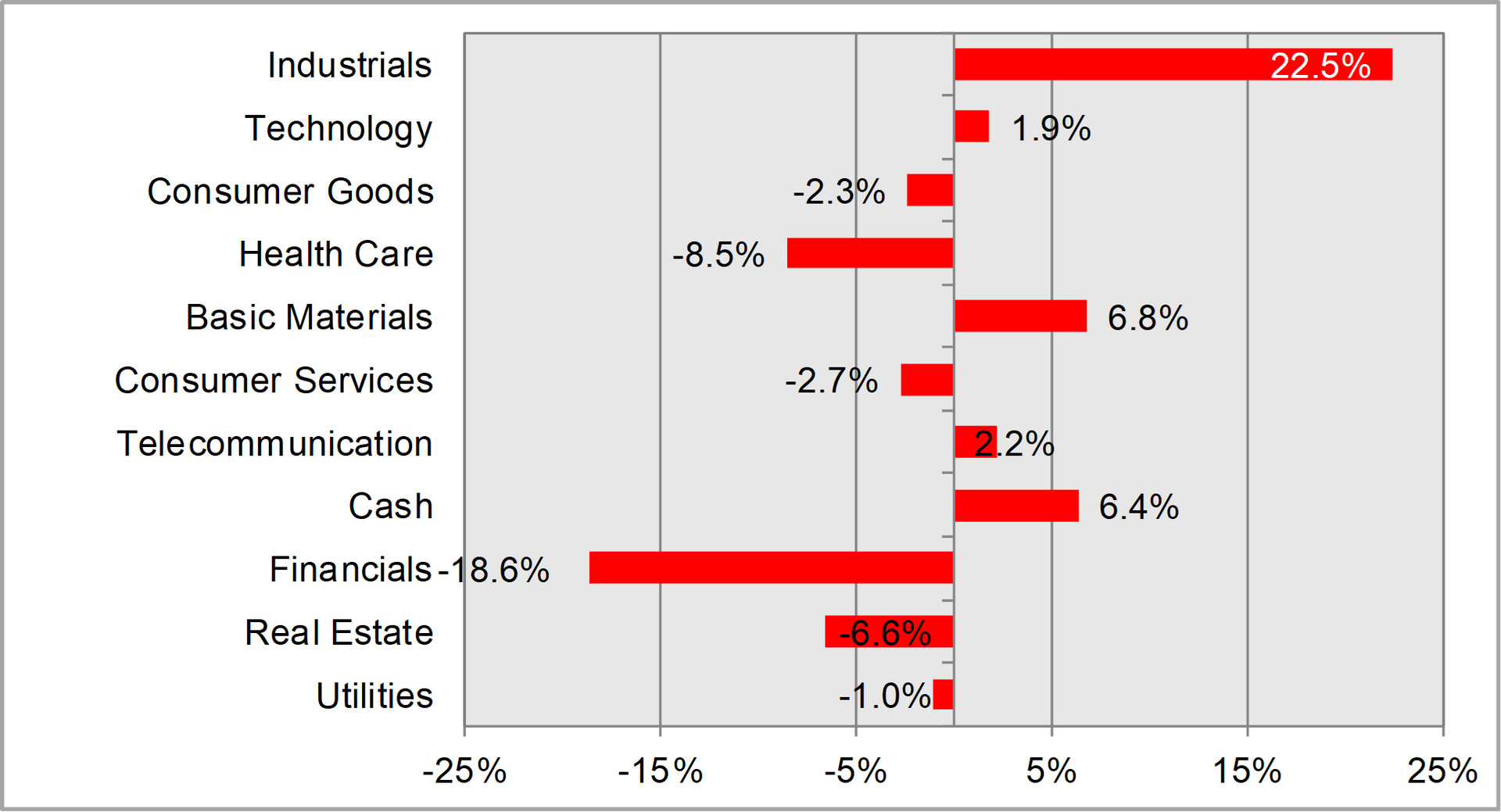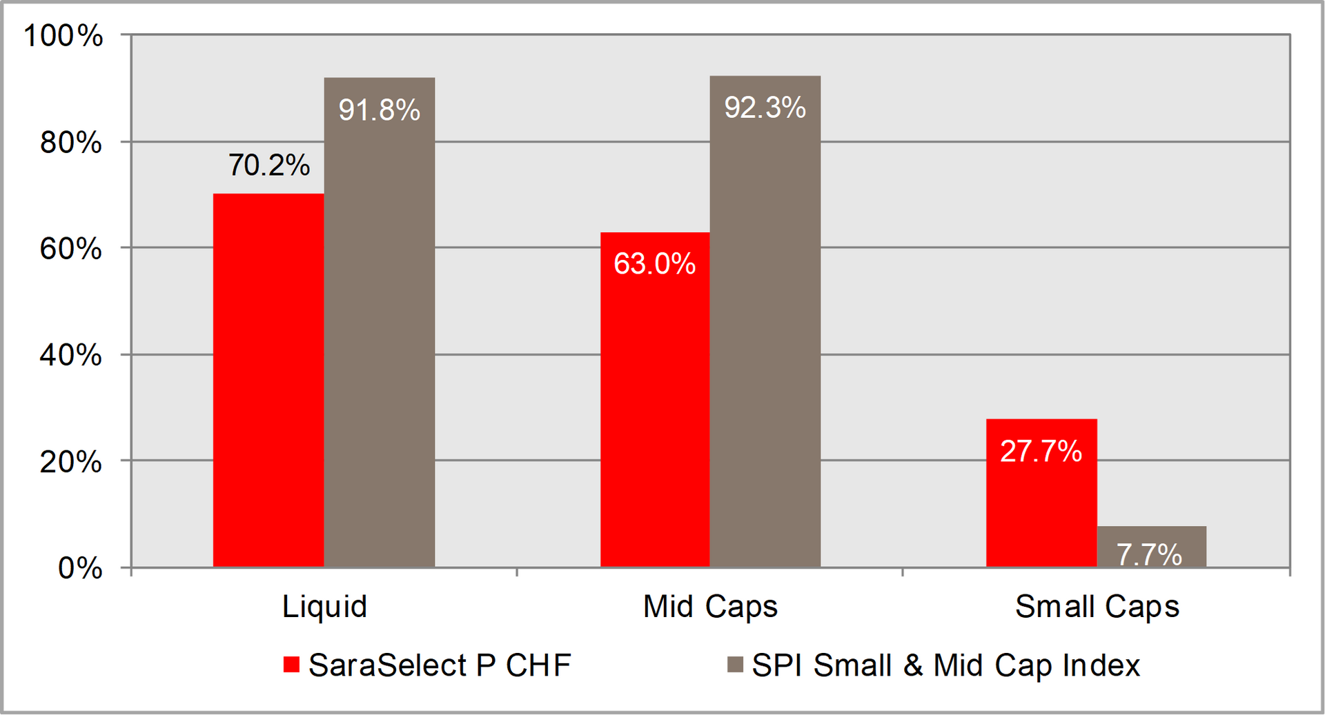 With roughly CHF 1'000 mn asset under management SaraSelect belongs to the bigger funds in the area of Swiss small & mid caps. Contrary to many other funds, we live an active benchmark independant approach, as the two charts show.