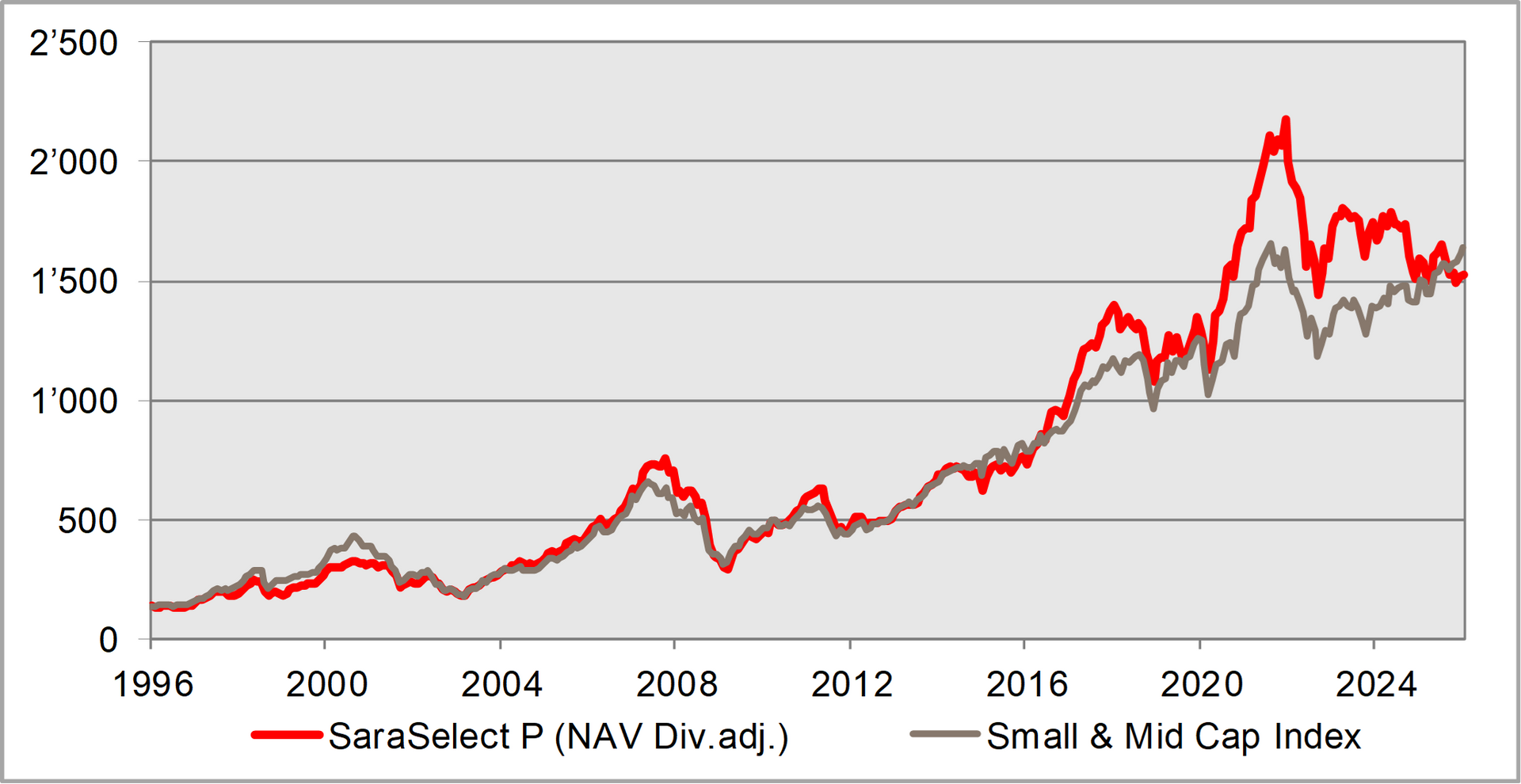 Seit Lancierung des Fonds im Jahr 1996 haben wir mit dem SaraSelect-Fonds im Durchschnitt eine jährliche Rendite von 8.41% (nach Kosten!) für unsere Anleger erzielt. Somit hat sich eine Startinvestition von CHF 100'000 innert 30.0 Jahren auf CHF 1'127'406.- vermehrt, dies inkl. steueroptimierter Ausschüttungen.