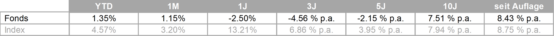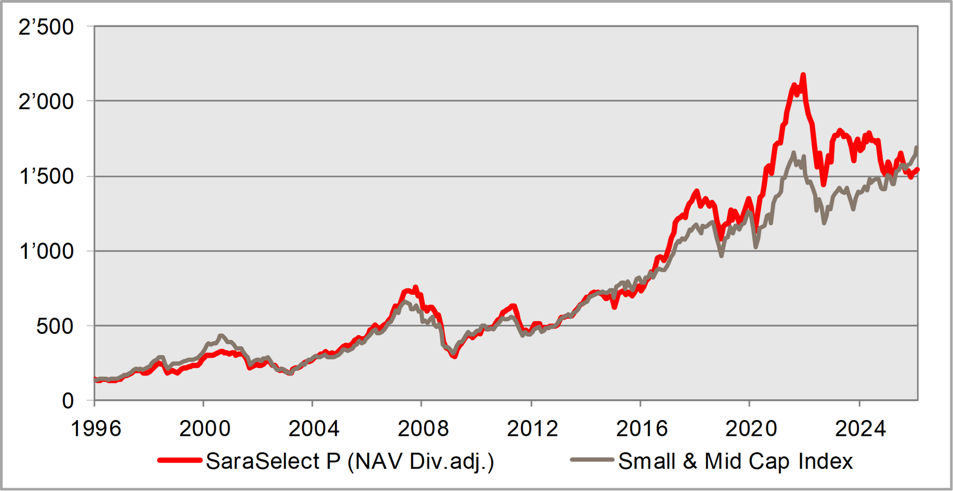 Seit Lancierung des Fonds im Jahr 1996 haben wir mit dem SaraSelect-Fonds im Durchschnitt eine jährliche Rendite von 8.43% (nach Kosten!) für unsere Anleger erzielt. Somit hat sich eine Startinvestition von CHF 100'000 innert 30.08 Jahren auf CHF 1'140'821.- vermehrt, dies inkl. steueroptimierter Ausschüttungen.